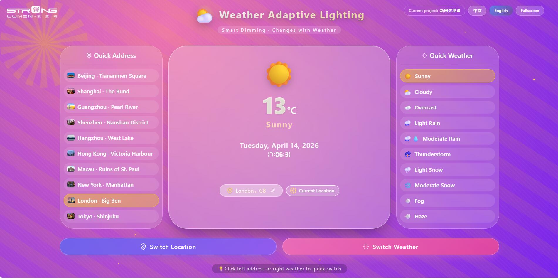 The system uses a touch control display to visualize real-time, location-based weather data worldwide, with lighting color temperature adapting accordingly. Visitors can interact with the system on-site and experience these changes in real time.
