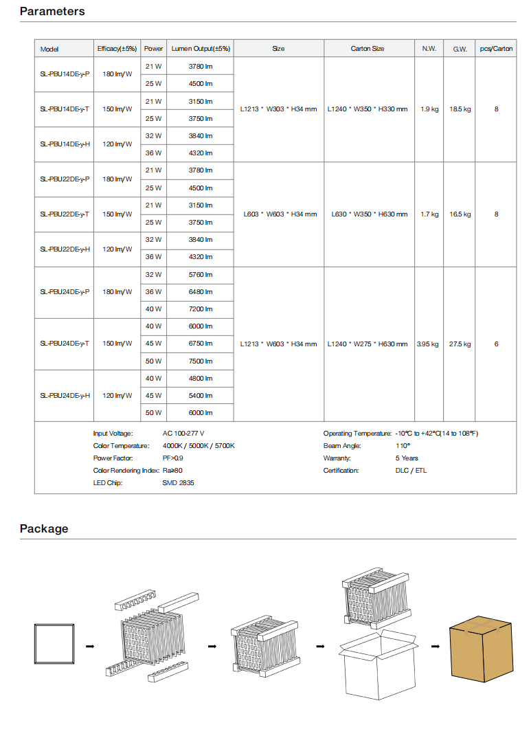 Premium Lighting Solution: Offering three efficiency grades (120/150/180 lm/W) with 21W-50W power options and 3,150-7,200 lumen output, these panels deliver professional UGR<19 illumination with 110° wide beam angles and Ra≥80 color accuracy. Featuring universal 100-277V input, -10°C to +42°C operation, and DLC/ETL-certified SMD 2835 LEDs, they combine energy-efficient performance (PF>0.9) with 5-year warranty protection for commercial applications.