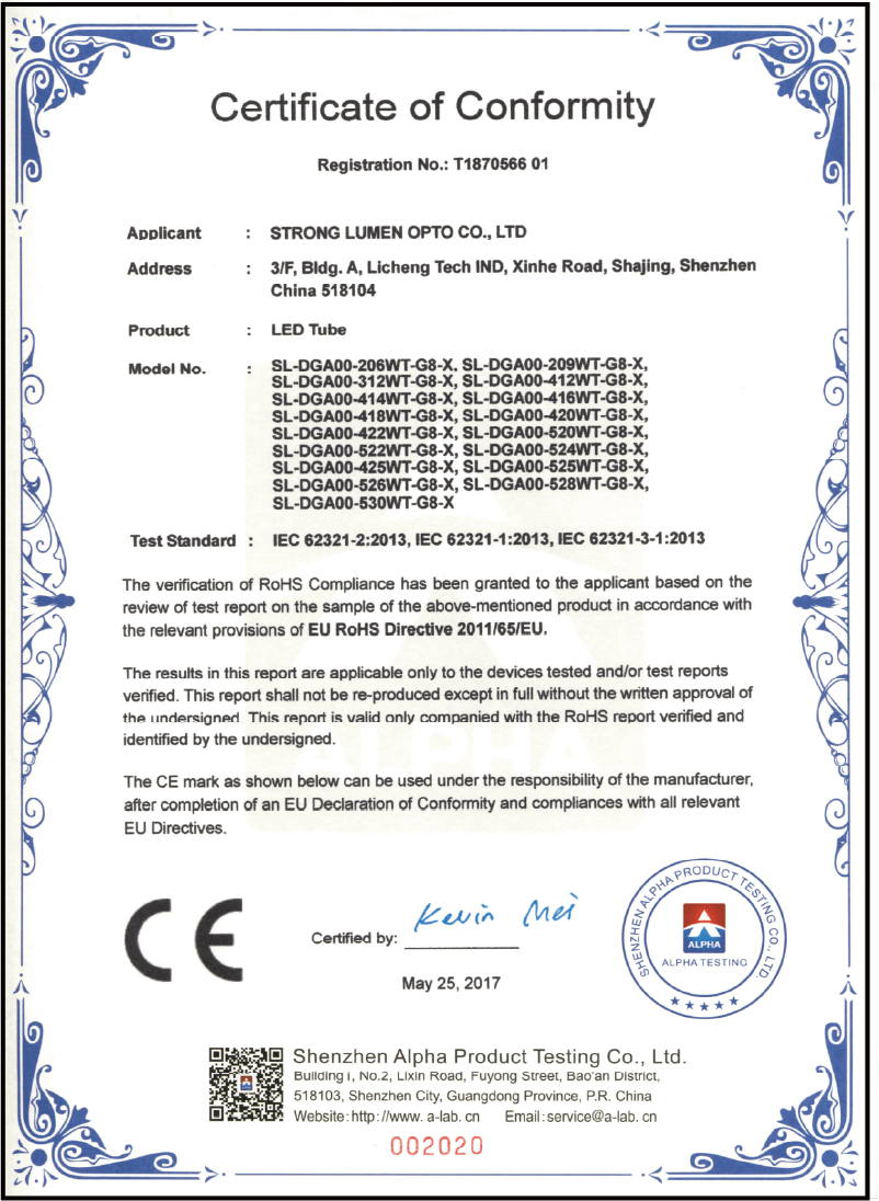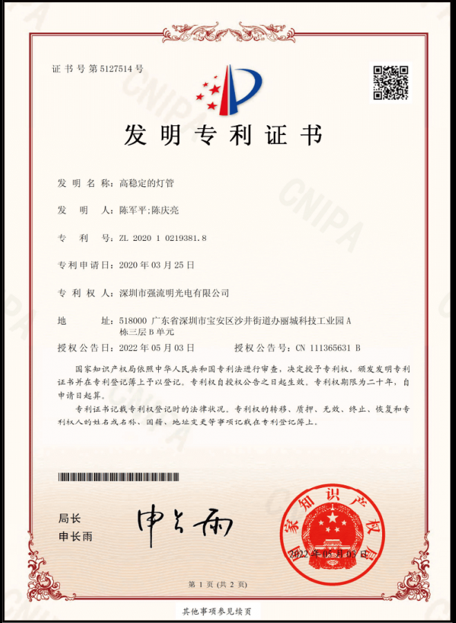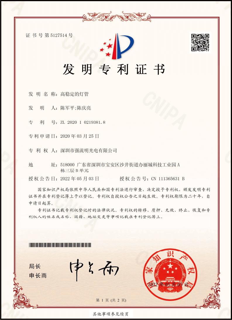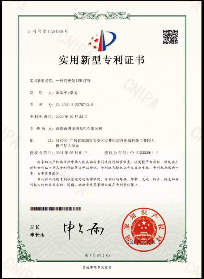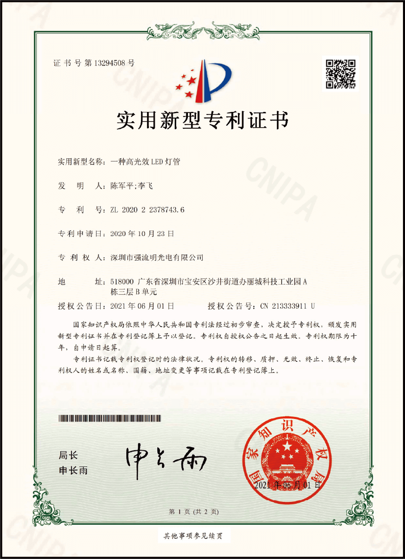 • Utility Model Patent Certificate - A High Light Efficiency LED Tube