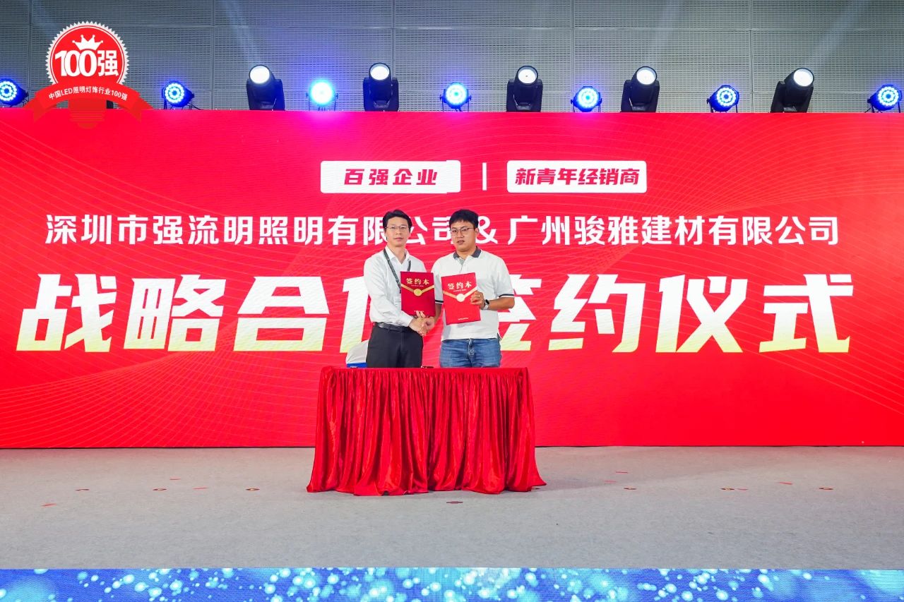 During the ceremony, QLM Lighting signed a strategic partnership with Guangzhou Junya Building Materials Co., Ltd.