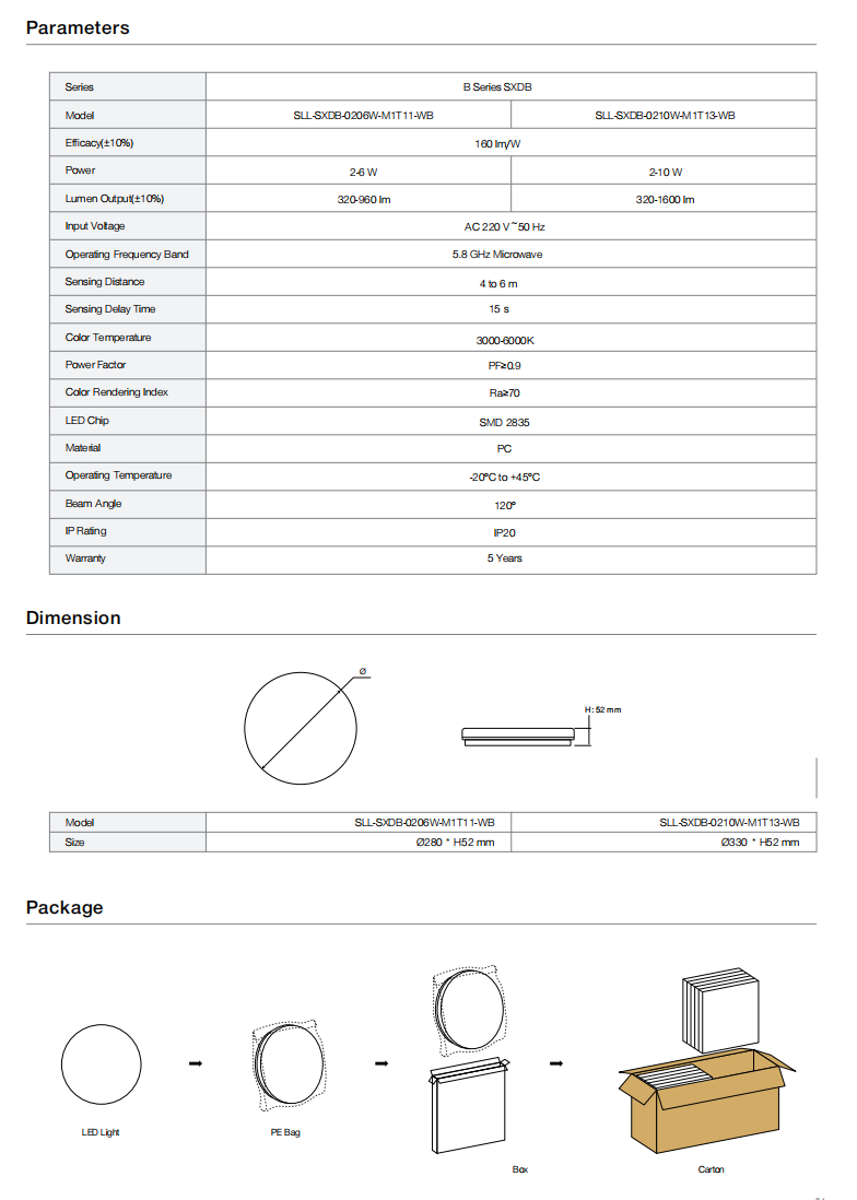 High-Efficiency Sensor Lighting Solution: Delivering ultra-high 160 lm/W efficacy with adjustable 2-6W (320-960 lm) and 2-10W (320-1600 lm) output options, this fixture features 5.8GHz microwave sensing (4-6m range) with 3000K-6000K CCT tuning and 120° beam angle. The durable PC housing offers -20°C to +45°C operation with IP20 rating, SMD 2835 LEDs, PF≥0.9 efficiency and 5-year warranty for energy-efficient indoor lighting.
