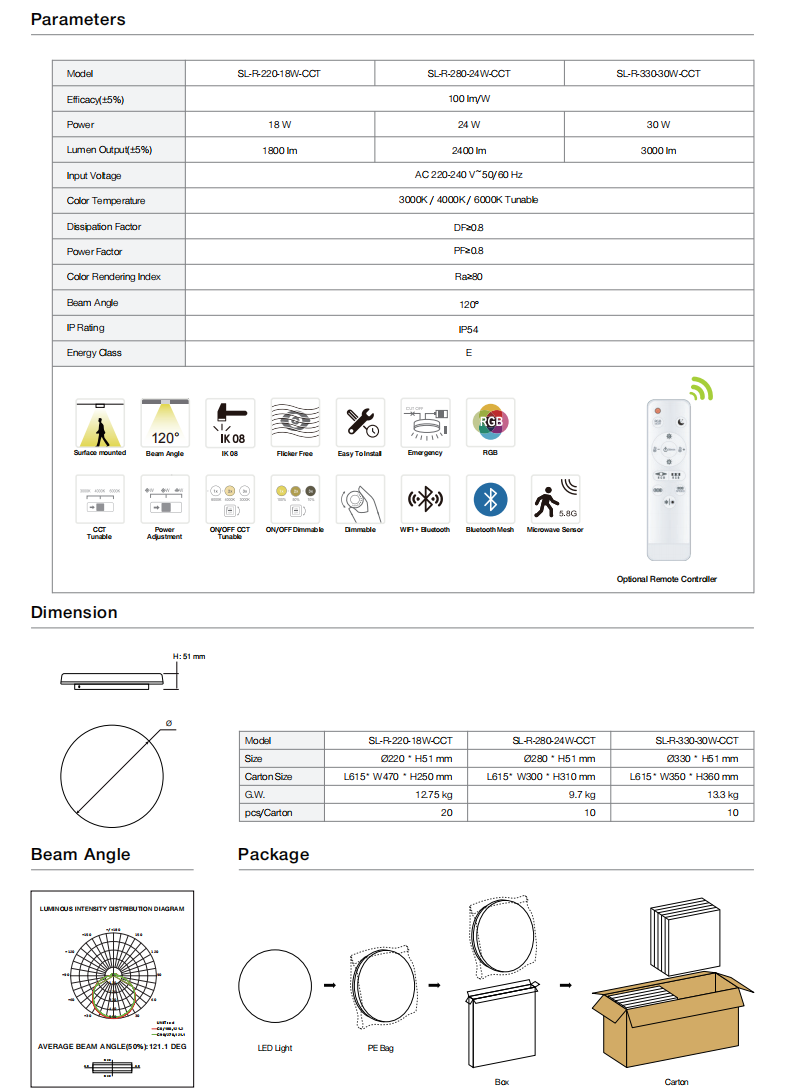 Advanced Smart Panel: Delivering 100 lm/W efficiency with 18W(2400 lm)/24W(3000 lm) options, this fixture features 3000K-6000K tunable white plus full RGB control, IP54/IK08 protection, and emergency backup in a surface-mount design. With WiFi/Bluetooth/Mesh connectivity, 120° beam angle, and Ra≥80 color rendering (DF≥0.8/PF≥0.8), it supports ON/OFF CCT tuning, smooth dimming, and power adjustment for AC 220-240V commercial applications.