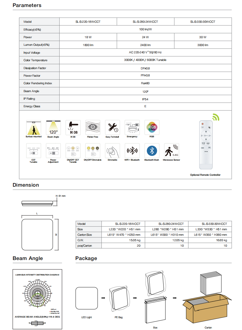 Smart Panel Light Solution: Featuring 18W(1800lm)/24W(2400lm)/30W(3000lm) power options with 100lm/W efficacy, this fixture offers 3000K-6000K CCT tuning, WiFi/Bluetooth/Mesh control, and smooth dimming in a surface-mount design. The IP54/IK08-rated panel combines 120° beam angle, Ra≥80 color rendering, and emergency function with PF≥0.8/DF≥0.8 efficiency for commercial spaces.