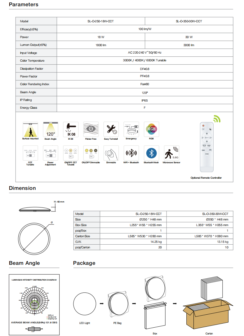 Advanced Commercial Lighting Solution: Delivering 100 lm/W high efficacy with 18W(1800 lm) output and AC 220-240V compatibility, this IP65/IK08-rated fixture features 3000K-6000K CCT tuning, WiFi/Bluetooth/Mesh connectivity, and smooth dimming in a surface-mount design. Combining 120° beam angle, Ra≥80 color rendering, emergency function with PF≥0.8/DF≥0.8 efficiency (Class F), it‘s engineered for demanding retail and outdoor commercial applications.