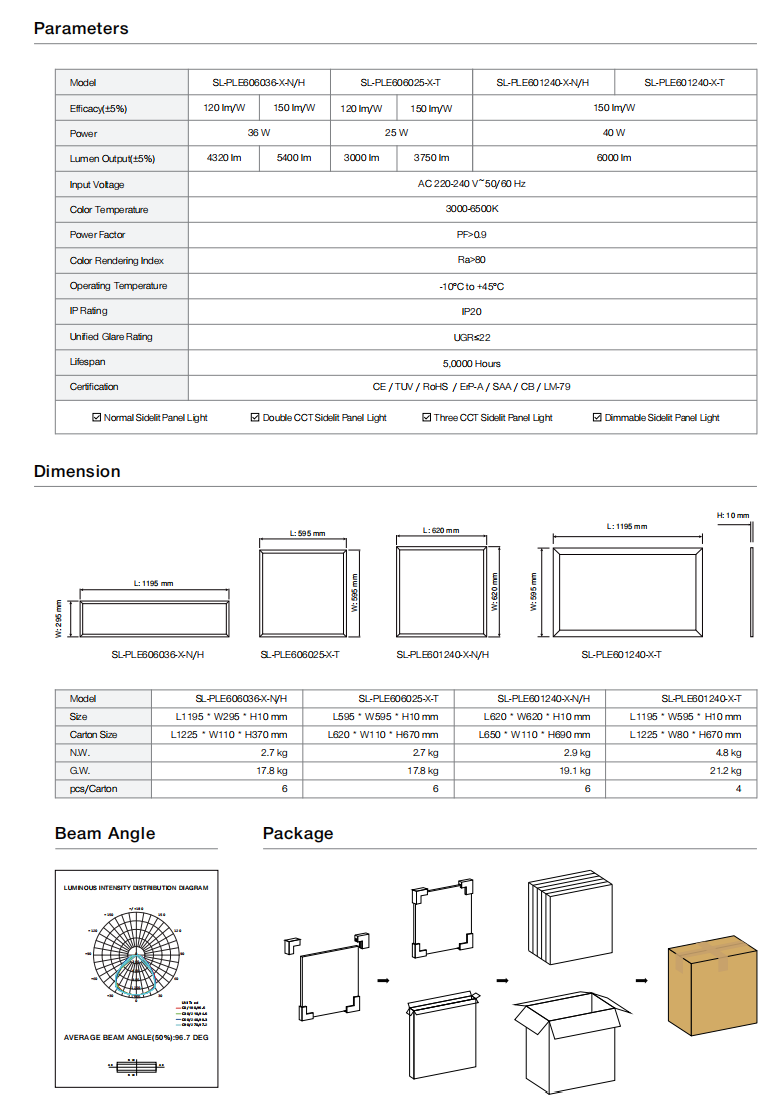Professional Lighting Solution: Featuring standard (120 lm/W) and high-efficiency (150 lm/W) models with 25-40W power options delivering 3,000-6,000 lumens, these fixtures offer adjustable 3000K-6500K CCT, Ra>80 color rendering, and UGR≤22 certified performance in robust construction. With universal 220-240V input, -10°C to +45°C operation, 50,000-hour lifespan, and CE/TUV/RoHS certifications, the IP20-rated panels deliver PF>0.9 efficiency for superior commercial lighting.