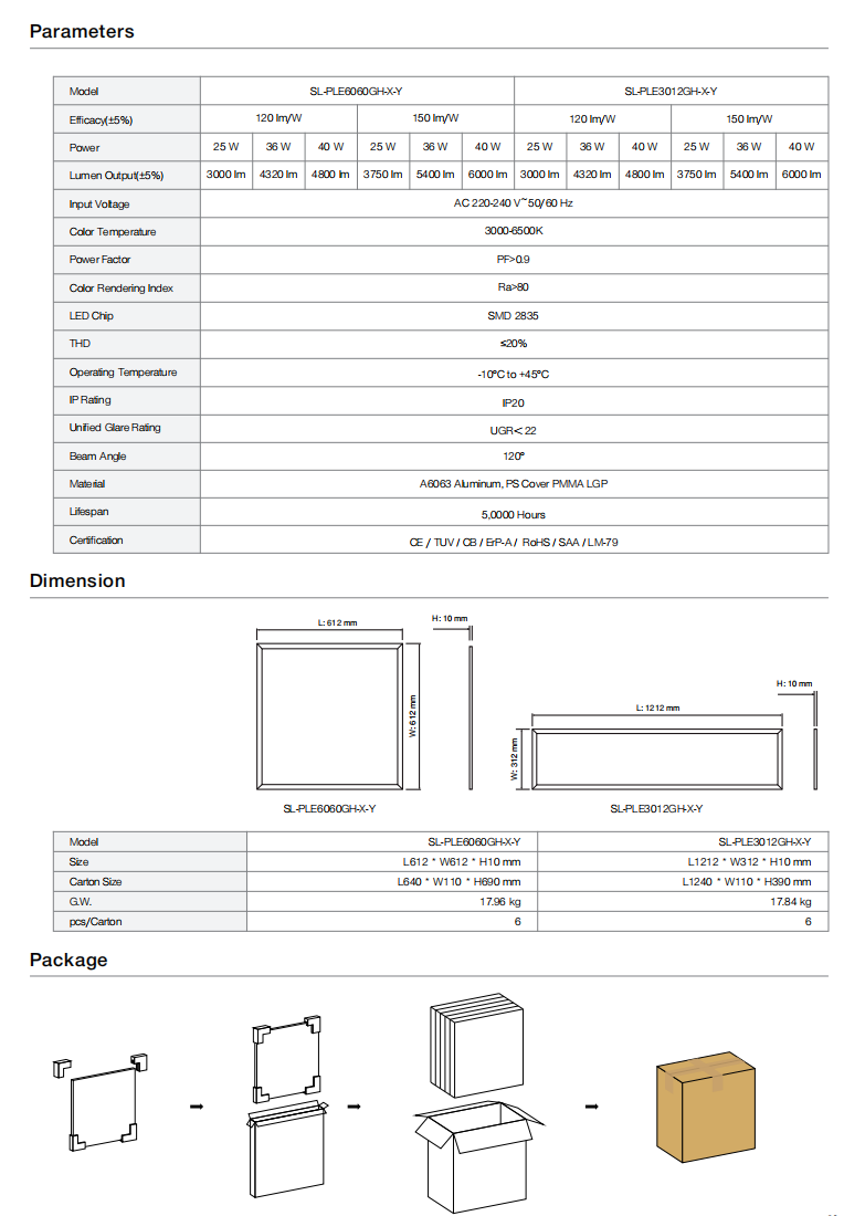 Premium Lighting Solution: Offering standard (120 lm/W) and high-efficiency (150 lm/W) models with 25-40W power options delivering 3,000-6,000 lumens, these fixtures feature adjustable 3000K-6500K CCT, Ra>80 color accuracy, and UGR<22 certified low-glare performance with 120° wide beam angle in durable A6063 aluminum/PS+PMMA construction. With universal 220-240V input, -10°C to +45°C operation, 50,000-hour lifespan, and CE/TUV/CB/ErP/RoHS certifications, the IP20-rated panels combine PF>0.9 efficiency with THD≤20% for superior commercial indoor lighting applications.