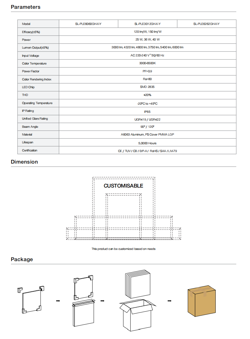 Industrial-Grade Lighting Solution: Offering standard (120 lm/W) and high-efficiency (150 lm/W) models with 25W/36W/40W power options delivering 3,000-6,000 lumens, these professional fixtures feature adjustable 3000K-6500K CCT, Ra>80 color accuracy, and dual UGR≤19/22 certified low-glare performance with selectable 90°/120° beam angles. Built with rugged A6063 aluminum frame and PMMA light guide, the IP65-rated units withstand -20°C to +45°C environments with 50,000-hour lifespan, combining universal 220-240V input, PF>0.9 efficiency and THD≤20% performance, fully certified by CE/TUV/CB/ErP-A for demanding commercial, educational and industrial applications.