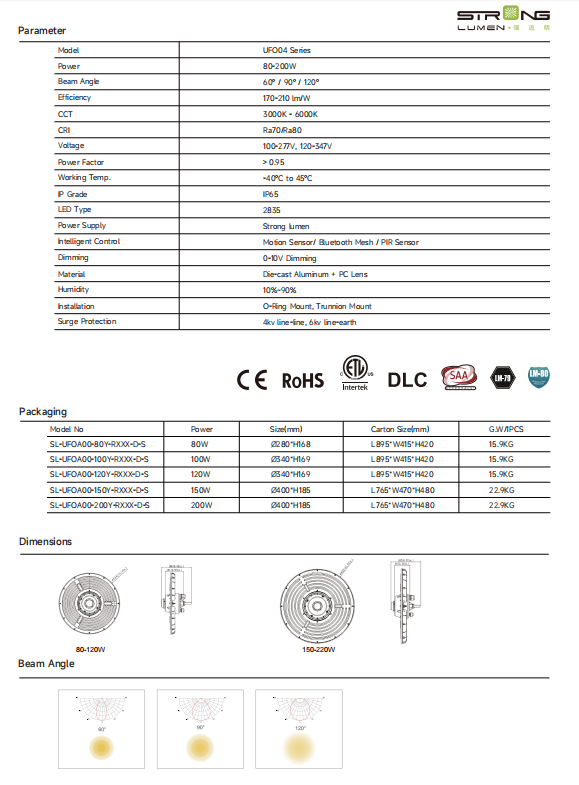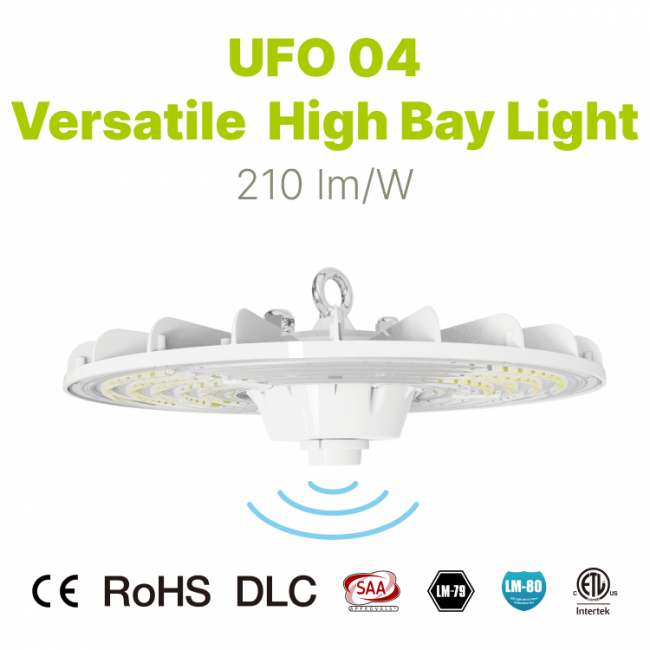 UFO 04工矿灯提供高达210 lm/W的超高光效(环形透镜),兼顾节能与亮度表现。双透镜可选:颗粒透镜(160 lm/W,柔和光),环形透镜(200–210 lm/W,聚光)。支持CCT可调(3000K–6000K)、显指Ra70/Ra80,适配不同环境。支持0-10V调光,并兼容PIR、微波和蓝牙Mesh传感器,实现智能照明。采用压铸铝+PC透镜,结构轻巧,适合高空安装。支持100-277V / 120-347V宽电压,具备4kV/6kV浪涌保护,IP65防护,-40°C至45°C工作温度,湿度适应10%-90%。多种安装方式(O型挂钩/支架),支持60°/90°/120°配光,适用于欧洲、澳洲市场的工业与商业空间。