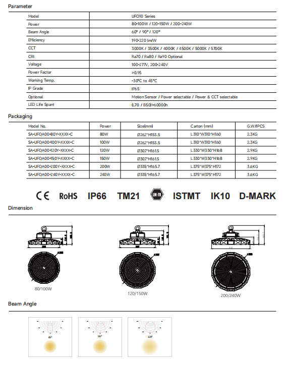 UFO 10系列工矿灯以高达220 lm/W的超高光效领先业界,结合优质LED技术,确保亮度与稳定性兼备。支持PIR、微波及蓝牙Mesh传感器,搭配0-10V与DALI调光,实现智能节能照明。功率与色温(80W–240W,3000K–5700K)现场可调,满足多样应用;显指Ra70/Ra80/Ra90可选,Ra90适用于零售与精密作业场所。IP65防护等级,适应-30°C至45°C工作环境,寿命达60,000小时(L70/B50)。全球电压兼容(100-277V & 200-240V),功率因数高达0.95。即插式传感器设计,安装简便,提供60°/90°/120°配光方案,广泛适用于工业与商业场景。