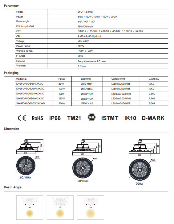 UFO 11工矿灯兼具性价比与性能,光效达150–200 lm/W,采用优质2835灯珠,确保稳定亮度与长寿命。支持即插即用式传感器,功率与色温(80W–200W,3000K–5700K)可现场调节,灵活应对多种应用需求。铝制外壳搭配PC透镜,结构轻巧(较传统灯具减重30%),具备IP65防护等级,适用于-30°C至40°C的严苛环境。免工具安装传感器,60°/90°/120°光束角可选,安装维护更简便。支持200-240V输入,功率因数>0.95,节能表现优异,特别适配欧洲与亚洲市场,附带5年质保,可靠无忧。