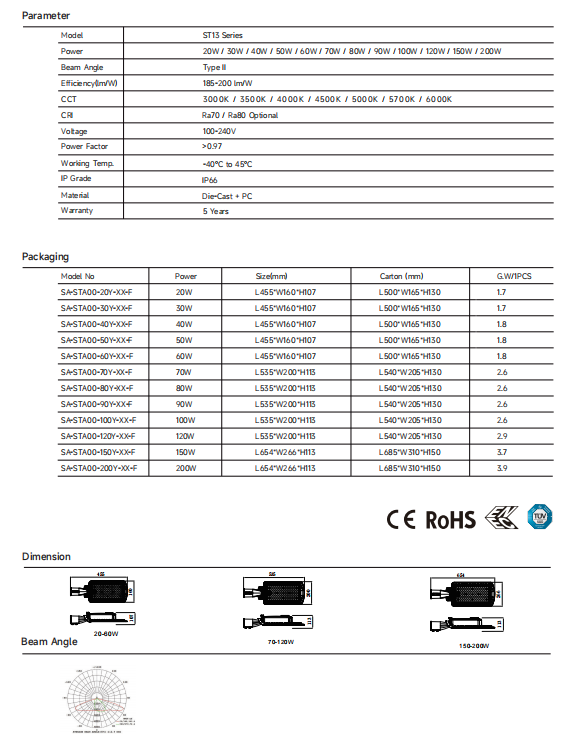 ST 13系列路灯具备 185–200 lm/W 超高光效,相比 HPS 节能 70%,比普通 LED 再节能 30%。功率因数高达 >0.97,降低电费 5–8%。支持 CAT.1、LoRa、Zigbee 远程控制与光感器自动启停,具备光通量补偿功能,可延长寿命 20%。分体式结构配合内置水平仪,1 分钟即可完成驱动更换,无需工具;模块化 SKD 设计,利于全球快速部署。提供 OEM/ODM 客制化服务(如空气质量传感器集成),光学系统采用 EN13201 标准 Type II 配光,6000K 冷白光适用于高速路与隧道。压铸铝+PC 外壳通过 MIL-STD-810G 测试,耐风暴与盐雾,-40°C 至 45°C 可用,镜片 20 年抗UV不黄变,具备 CE/FCC/RoHS/CB 认证,质保 5 年。