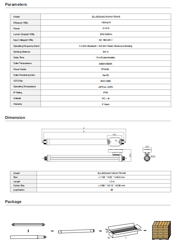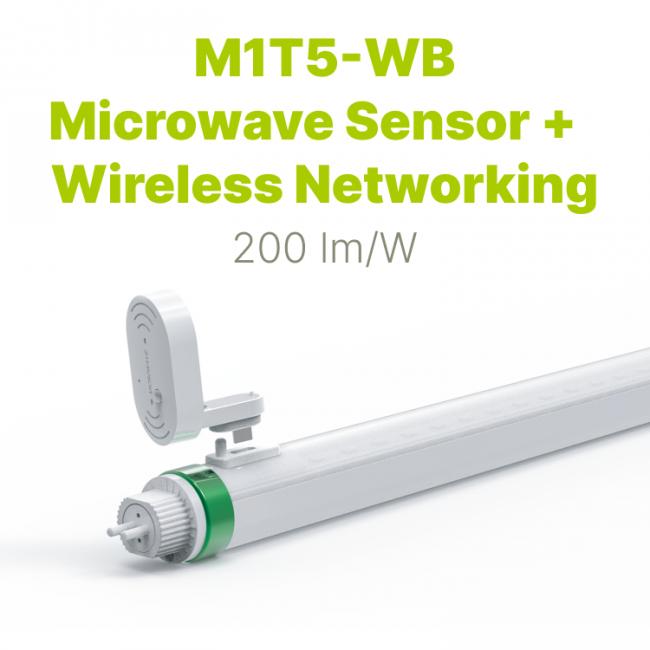 M1T5-WB微波感应灯管采用5.8GHz微波传感技术,实现人来灯亮、人走灯灭的智能控制,超亮低耗更节能。支持单/双端电源输入(内置驱动),安装便捷。航空铝+PC材质坚固耐用,光衰极低,3年质保。新增无线组网功能,可接入智能照明系统,-20°C至55°C宽温域设计适应各种环境。适用于办公区、车间、停车场、酒店及超市等场所,集智能感应、高效节能与长寿命于一体,显著降低维护成本。